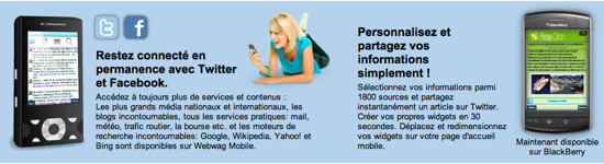 Proche de Netvibes et Snaptu dans l’esprit, Webwag mobile 3.0 offre l’accès à ses widgets depuis une simple application Java. Celle-ci intègre du coup les inévitables « réseaux sociaux Twitter et Facebook », avec la possibilité de partager n’importe quel article sur Twitter. La version 3.0 donne également accès aux fers de lance de la recherche sur le web : Google, Wikipedia, Yahoo! et Bing. Vous pouvez composer votre bureau mobile à partir de 1800 contenus et services, allant des quotidiens à la météo en passant par les programmes télé, les enchères, la bourse, le courrier électronique et le trafic. Webwag est compatible avec la plupart des téléphones Java (Samsung, Sony Ericsson, Nokia, LG) ainsi que les Blackberry, même tactiles.
