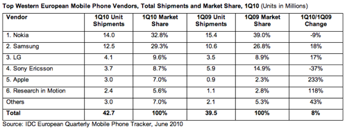 Le marché européen de la vente de mobiles se porte bien, foi d’IDC : il a connu une croissance de 8,1 % en un an, avec 42,7 millions d’unités vendues au premier trimestre 2010. Apple, RIM et HTC affichent un large sourire. LG et Samsung menacent Nokia et Sony Ericsson.
