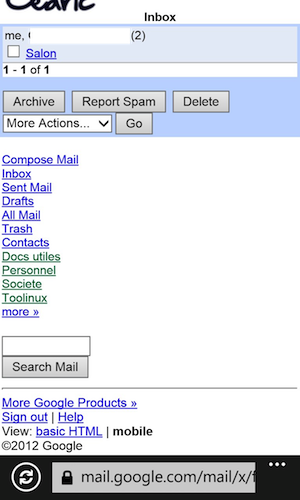 Et bien il faut croire qu’Internet Explorer 10, dont le support du HTML5 n’a rien à envier à Webkit, n’a accès qu’à une piètre version de Gmail… Cela dit, Microsoft ferait bien de permettre à des navigateurs tiers d’occuper le terrain. Ne serait-ce que pour voir Opera ou Mozilla sur les terminaux.
