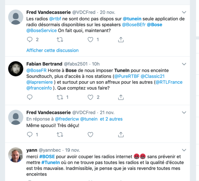 Levée de bouclier sur Twitter et les forums de Bose : Bose conseille de contacter… TuneIn. Le problème n’est pas limité à la Belgique francophone. Le site Tweakers relate en effet la gronde des auditeurs flamands privés de leurs chaînes de radio.