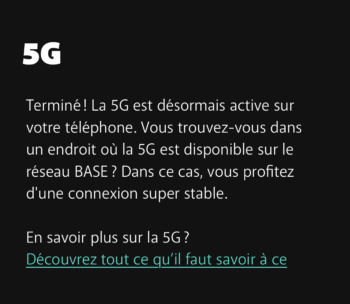« Vous pouvez activer la 5G si vous avez un appareil compatible 5G et un abonnement BASE récent. Vous vous trouvez à un endroit où la 5G est disponible sur le réseau BASE? Dans ce cas, vous profitez d’une connexion super stable. »