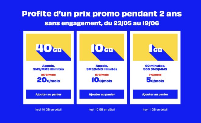 Et ce n’est pas tout, le volume de données est augmenté au fil des mois, de 25% grâce au hey! boost. Les 40 GB deviennent ainsi 80 GB après 12 mois.