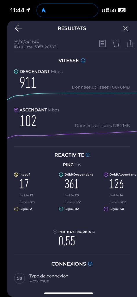 C’est en tout cas ce que nous avons constaté à de multiples endroits. La limitation à 500 Mbps semble avoir été levée, comme on peut le voir sur ce test effectué à Groenendael cette semaine avec un iPhone 15.
