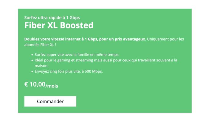 La formule Fiber XL culminait à 500 Mbps depuis plus de 3 ans, avec un upload à 100 Mbps, au prix de 45,95 €. Désormais, une option permet d’augmenter le débit à 1000/500 Mbps, tout comme c’est déjà le cas chez Mobile Vikings ou encore Youfone.