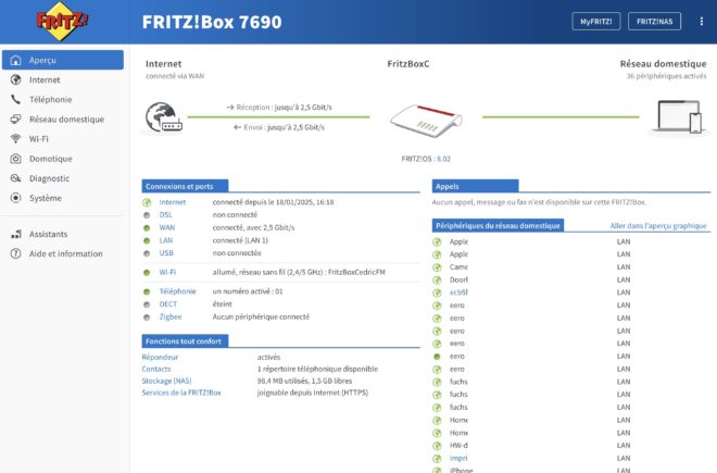 Comme toujours avec AVM, l’interface Fritz!OS est un point fort. Accessible depuis un navigateur, elle propose un tableau de bord clair et complet pour gérer :