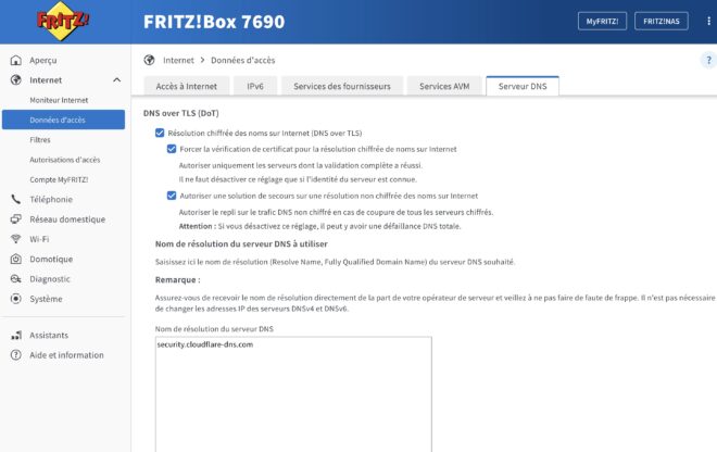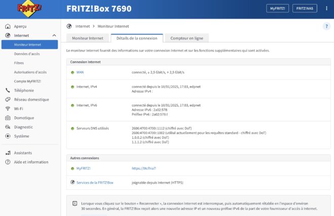 - Les paramètres réseau (connectivité, IPv6, DNS, compte myFritz!)